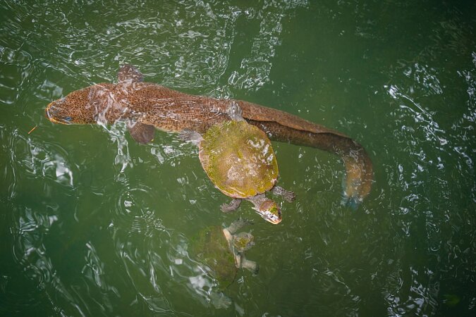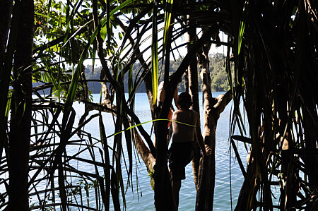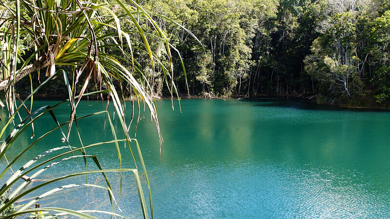 Lake Eacham is the smaller lake and, like Lake Barrine, has an avaerage depth of 65m and is the result of a volcanic explosion. The lake is a very popular picnic and swimming spot with locals. There are good walks through the cool upland rainforest, the water is very clear and you should be able to see turtles in the lake. Over 180 bird species have been recorded and you may even see the Musky Rat Kangaroo in the forest.